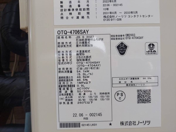 木曽岬町 ノーリツ石油給湯機付ふろがまOTQ-4706SAY 給湯器交換工事