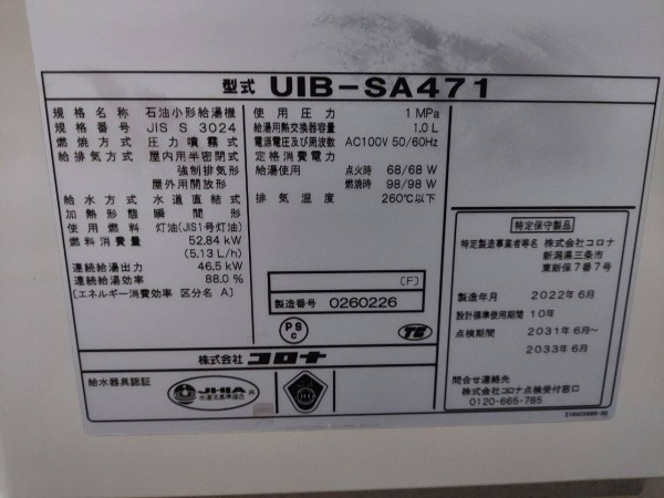 大台町 コロナ石油小形給湯機UIB-SA471、UIB-LD40X 給湯器交換工事