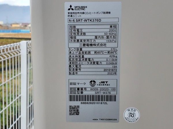 亀山市 三菱電機家庭用自然冷媒CO2ヒートポンプ給湯機貯湯ユニットSRT-WTK376D エコキュート交換工事