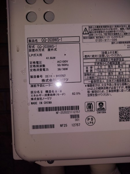 紀北町 ノーリツ給湯器GQ-2039WS-1 給湯器交換工事