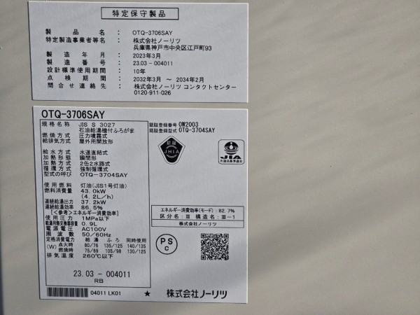 多気町 ノーリツ石油給湯機付ふろがまOTQ-3706SAY 給湯器交換工事