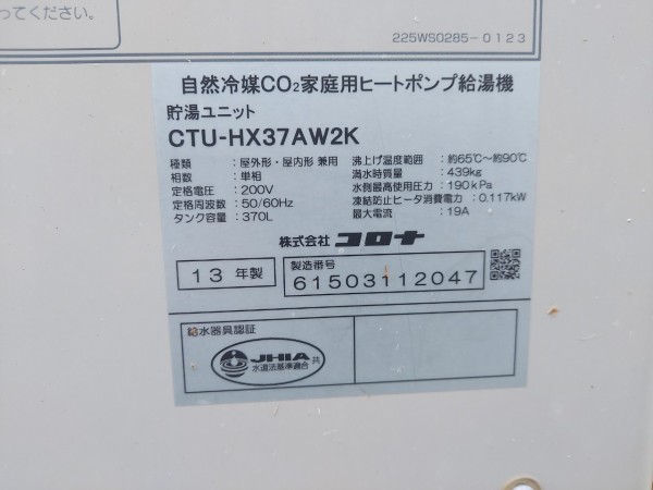 いなべ市 コロナエコキュート→コロナ自然冷媒CO2家庭用ヒートポンプ給湯機ヒートポンプユニットCHP-DZ601K エコキュート交換工事