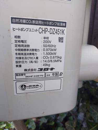 尾鷲市 コロナ自然冷媒CO2家庭用ヒートポンプ給湯機 貯湯ユニットCTU-37AZ1K、ヒートポンプユニットCHP-DZ451Kエコキュート交換工事
