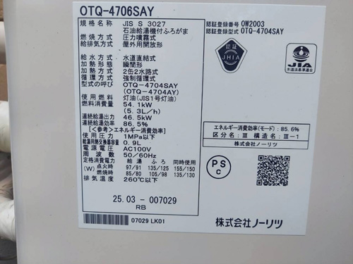 名張市柳原町 ノーリツ石油給湯機付ふろがまOTQ-4706SAY 給湯器交換工事
